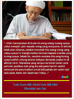 “..Allah menciptakan di dunia ini orang-orang kurang upaya untuk menjadi ujian kepada orang yang sempurna. Di akhirat kelak akan ditanya, setakat manakah kita orang-orang yang cukup upaya ini menghulurkan bantuan kepada mereka yang kurang upaya. Sebab itu, saudara-saudara kita yang kurang upaya sedikit untung kerana terlepas daripada soalan ini di akhirat nanti. Manakala yang sempurna tubuh badan pula perlulah pastikan duit yang dia ada pada hari ini sedikit sebanyak dia peruntukkan untuk beli pahala lain selain beli lauk-pauk, beras dan keperluan hidup…”